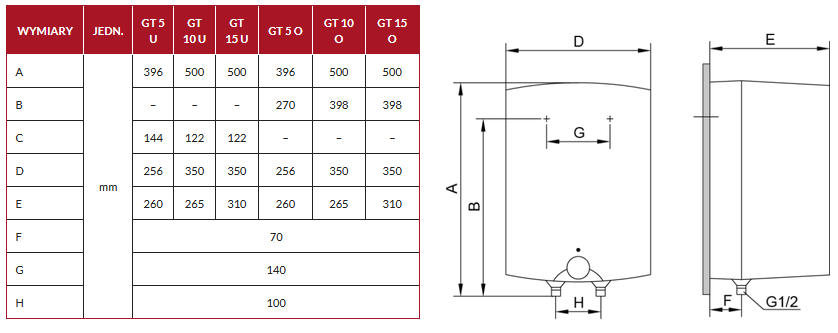 Zbiorniki podgrzewaczy wykonane są z wysokogatunkowej blachy stalowej i zabezpieczone są przed korozją emalią ceramiczną oraz ochronną anodą magnezową. Ze względu na ciśnieniowy charakter zbiornika, urządzenia mogą być podłączane do dowolnej baterii. Urządzenia wyposażono w elektryczny element grzejny o mocy 2,0 kW z nastawnym termoregulatorem umożliwiającym podgrzewanie wody użytkowej w zakresie 25 – 75°C oraz niesamoczynny wyłącznik termiczny, chroniący zbiornik przed przegrzaniem i uszkodzeniem.