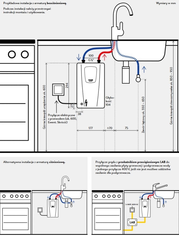 - Maksymalna temperatura na wylocie ustawiona fabrycznie na 50 °C, ustawienie temperatury jak zwykle poprzez domieszanie zimnej wody w armaturze