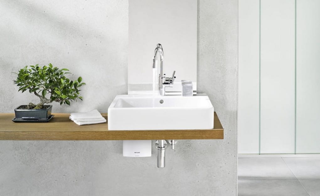 - Sterowany hydraulicznie przepływowy e-podgrzewacz (jednostka podblatowa) w formacie mini do energooszczędnego zasilania umywalki