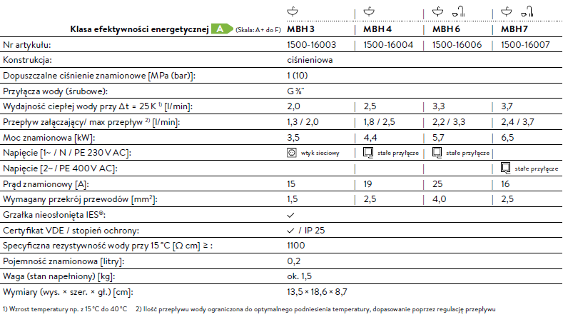 Ciśnieniowy przepływowy e-podgrzewacz MBH jest energooszczędnym, standardowym rozwiązaniem dla instalacji ze wszystkimi typowymi armaturami. Zestaw przyłączeniowy zawarty w dostawie ułatwia montaż bezpośrednio do armatury. A ciepła woda płynie wówczas, jak jest potrzebna.