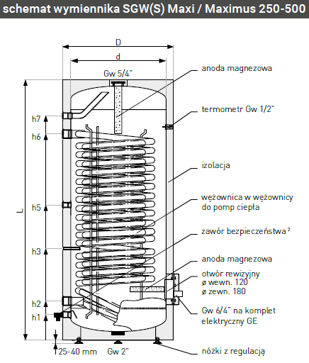 Galmet Maxi SGW(S) 250 L - Wymiennik stojący c.w.u. do pomp ciepła z dużą wężownicą spiralną 2,9m2 szary (26-258500N)