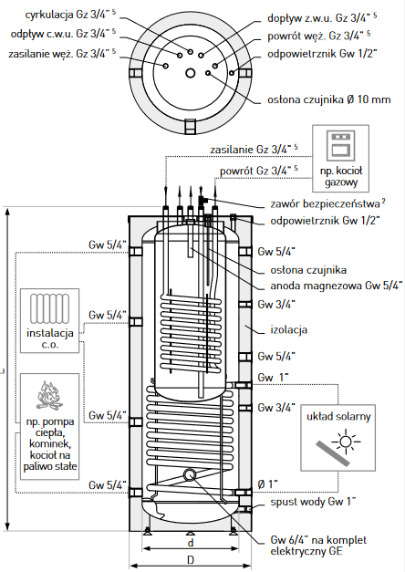 - Wężownica przystosowana do zasilania z kolektorów słonecznych.