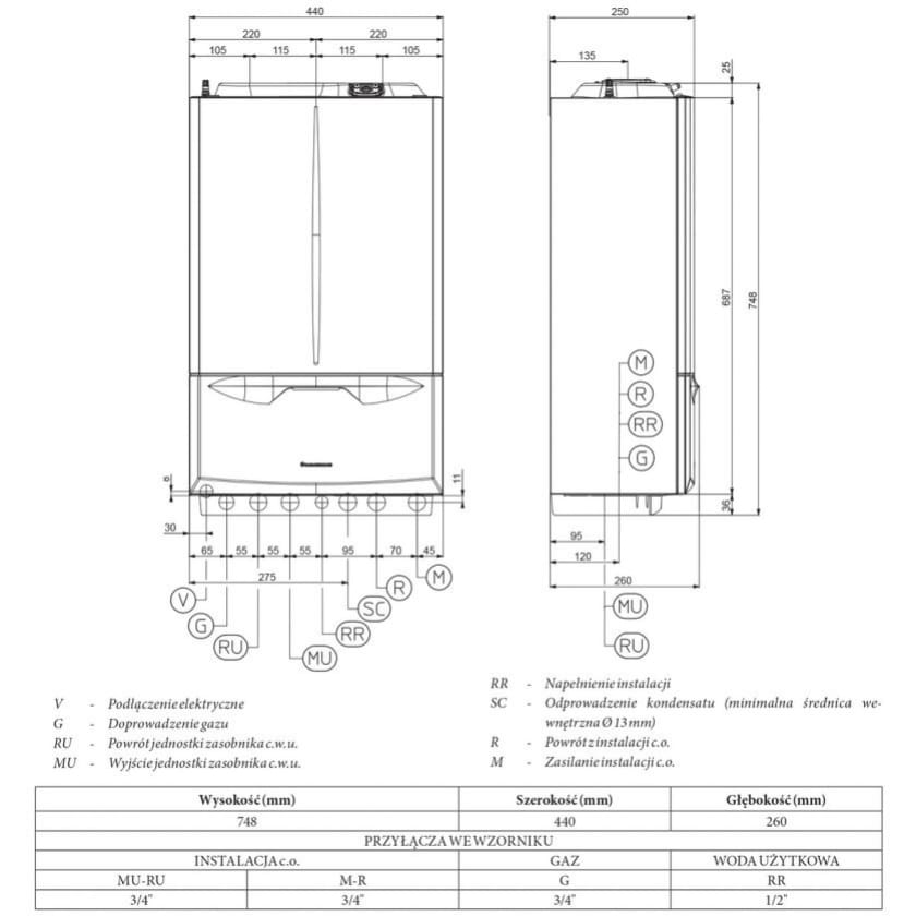 Kocioł gazowy kondensacyjny wiszący jednofunkcyjny (z możliwością podłączenia zewnętrznego zasobnika) z nowym wymiennikiem ze stali nierdzewnej w kompozytowej obudowie (w postaci jednorurowej wężownicy) oparty na sprawdzonym rozwiązaniu z poprzedniej generacji ale dodatkowo udoskonalony - co pozwala na osiągniecie sprawności 94%.