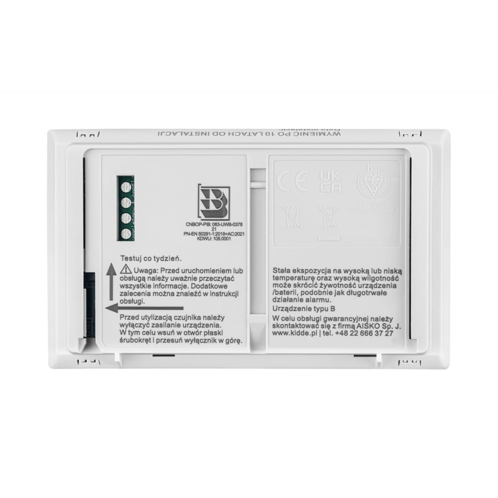 Czujnik tlenku węgla KIDDE K10LLCO posiada wbudowaną baterię itową, która nie wymaga wymiany przez cały okres użytkowania