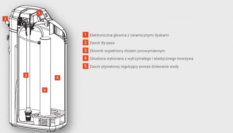 - Elektronicznie sterowana głowica umożliwiająca optymalną kontrolę bieżącej pracy zmiękczacza.