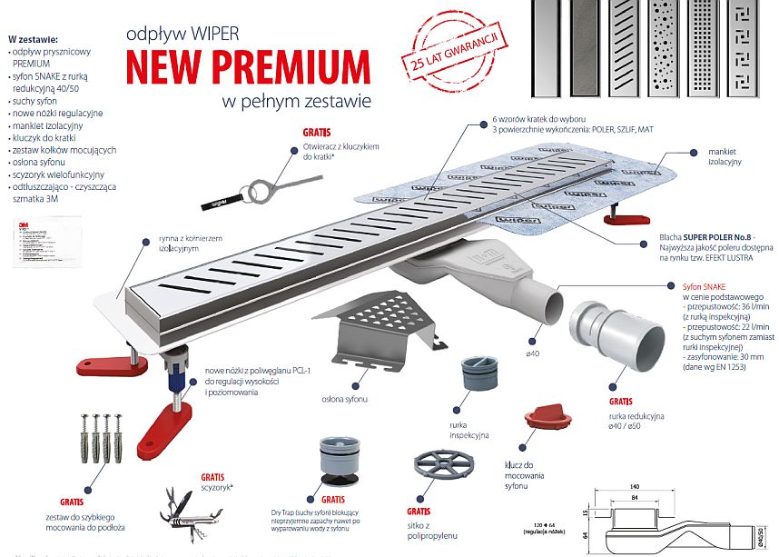Prysznicowe odwodnienie WIPER NEW Premium zostało stworzone jako kompletny zestaw montażowy, dzięki czemu nie trzeba samemu dobierać pojedynczych elementów bo wszystko jest już w komplecie. Wystarczy tylko wybrać długość odwodnienia, jeden z 6 wzorów kratek dekoracyjnych oraz kolor rusztu poler, szlif lub mat.