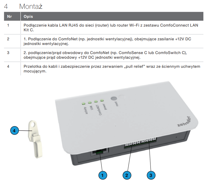 Urządzenie ComfoConnect LAN C nawiązuje połączenie pomiędzy systemem domowej wentylacji i „Zehnder ComfoControl” App. Urządzenie ComfoConnect LAN C można połączyć z urządzeniem ComfoAir Q, Comfort Vent Q lub AERISnext oraz odpowiednią aplikacją (dla instalatora i użytkownika końcowego). ComfoConnect LAN C za pośrednictwem aplikacji, może sterować jedną jednostką wentylacyjną. Urządzenie ComfoConnect LAN C można zamontować na ścianie, a zasilanie podłączyć do jednostki wentylacyjnej, poprzez 4-rdzeniowy kabel ComfoNet.